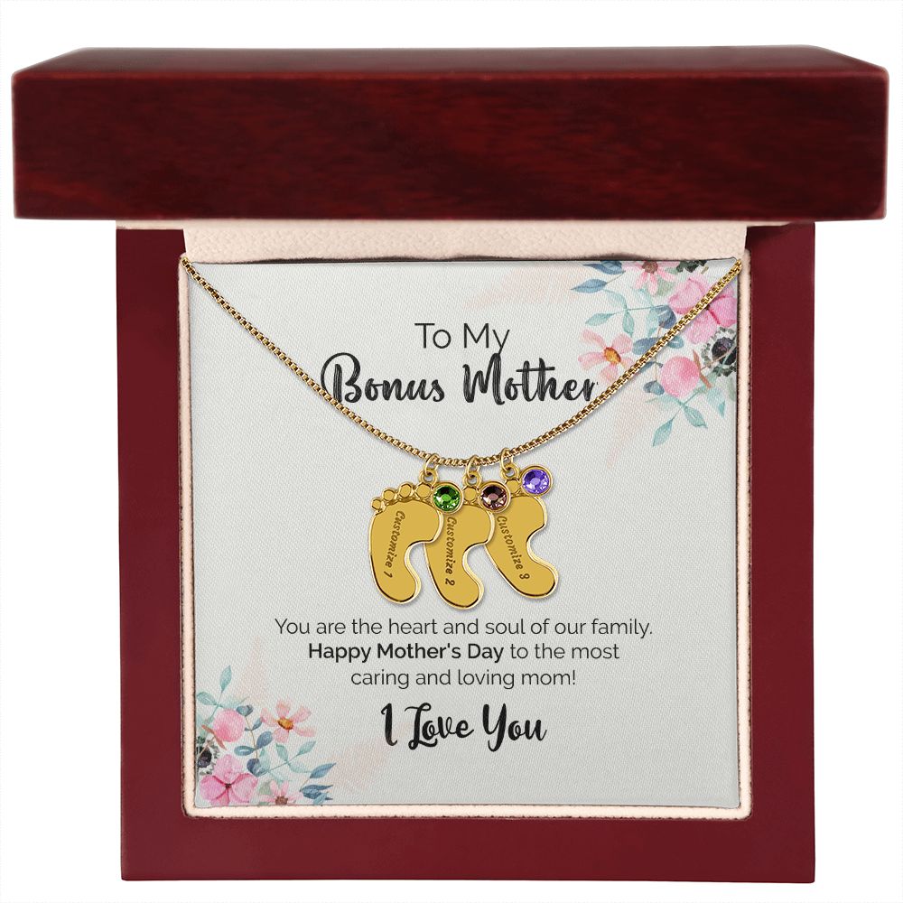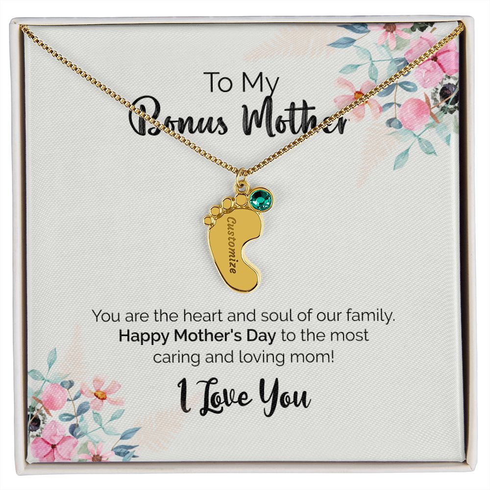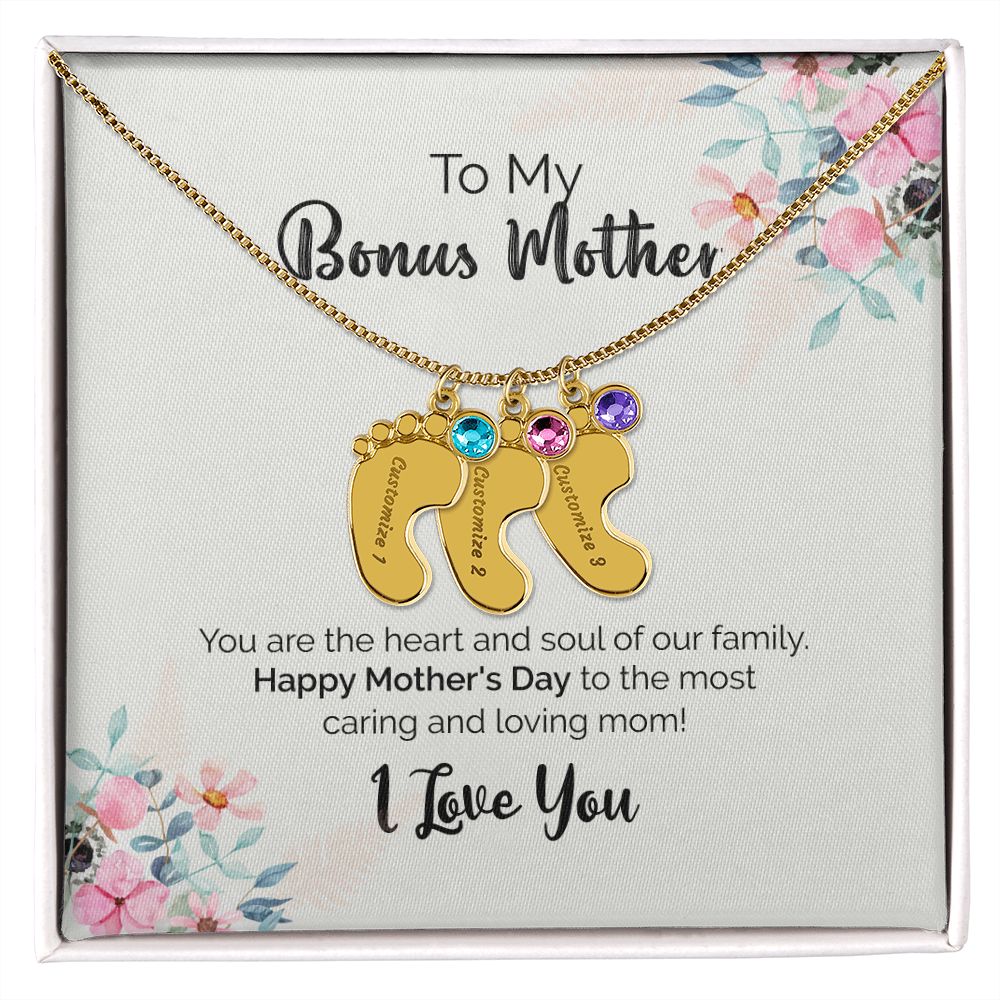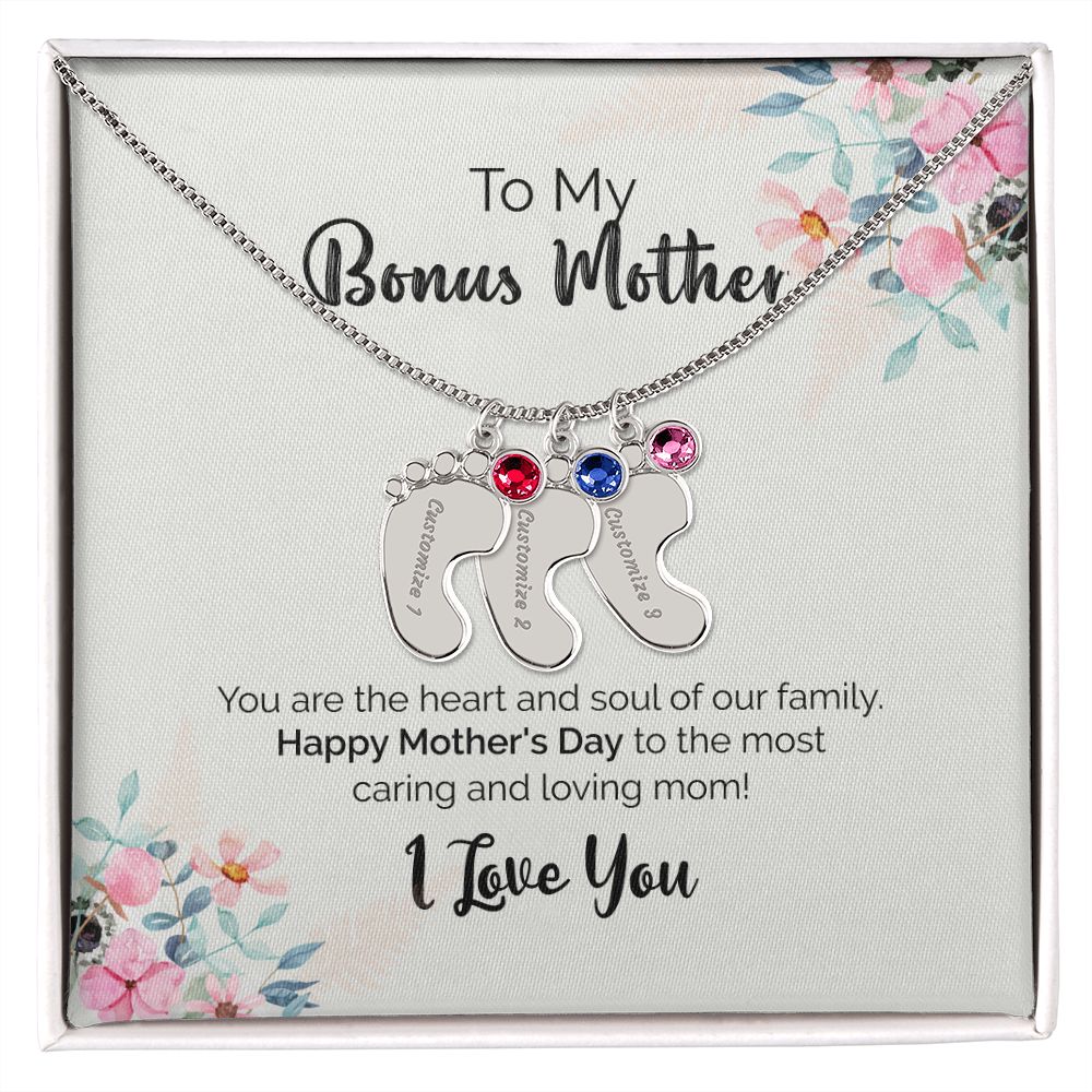 To My Bonus Mother | I Love You | Custom Baby Feet Necklace with Birthstone