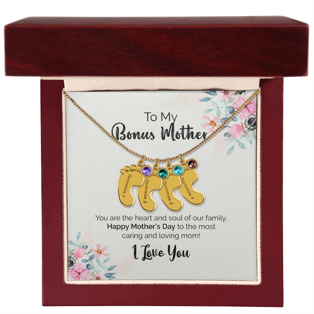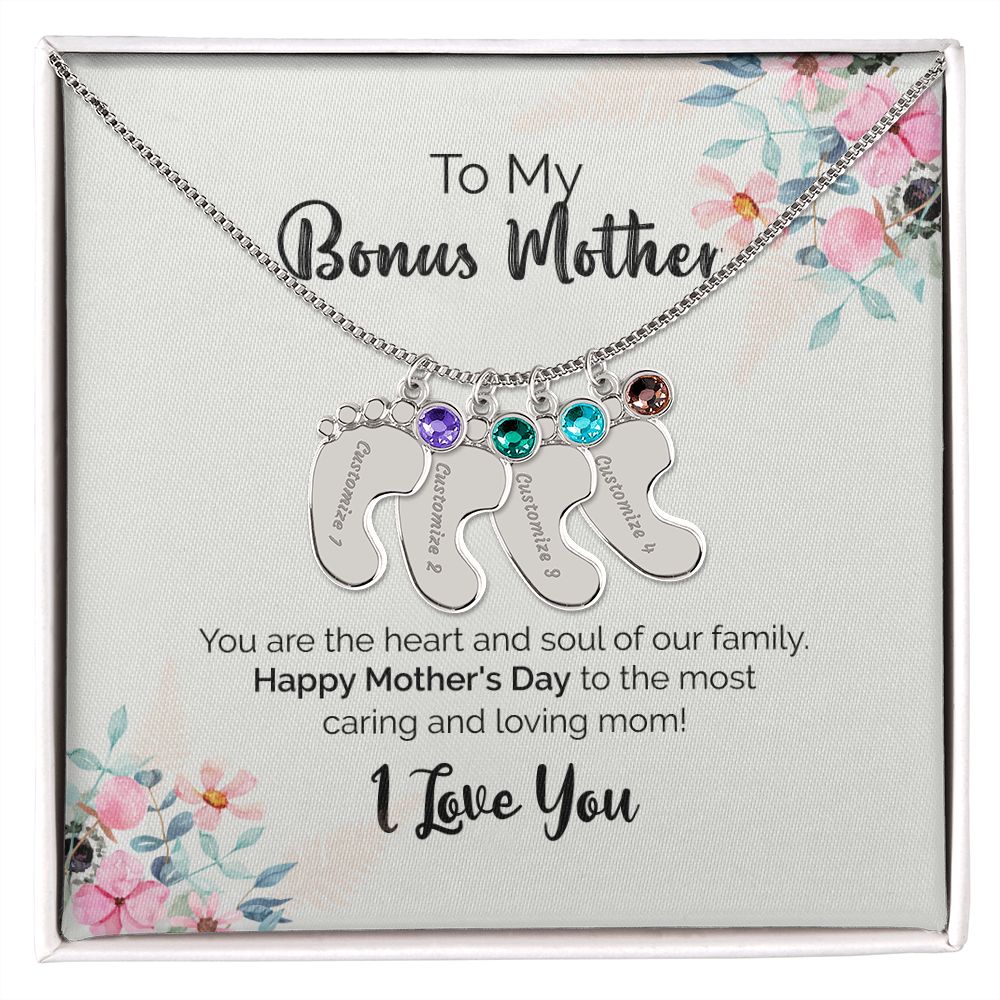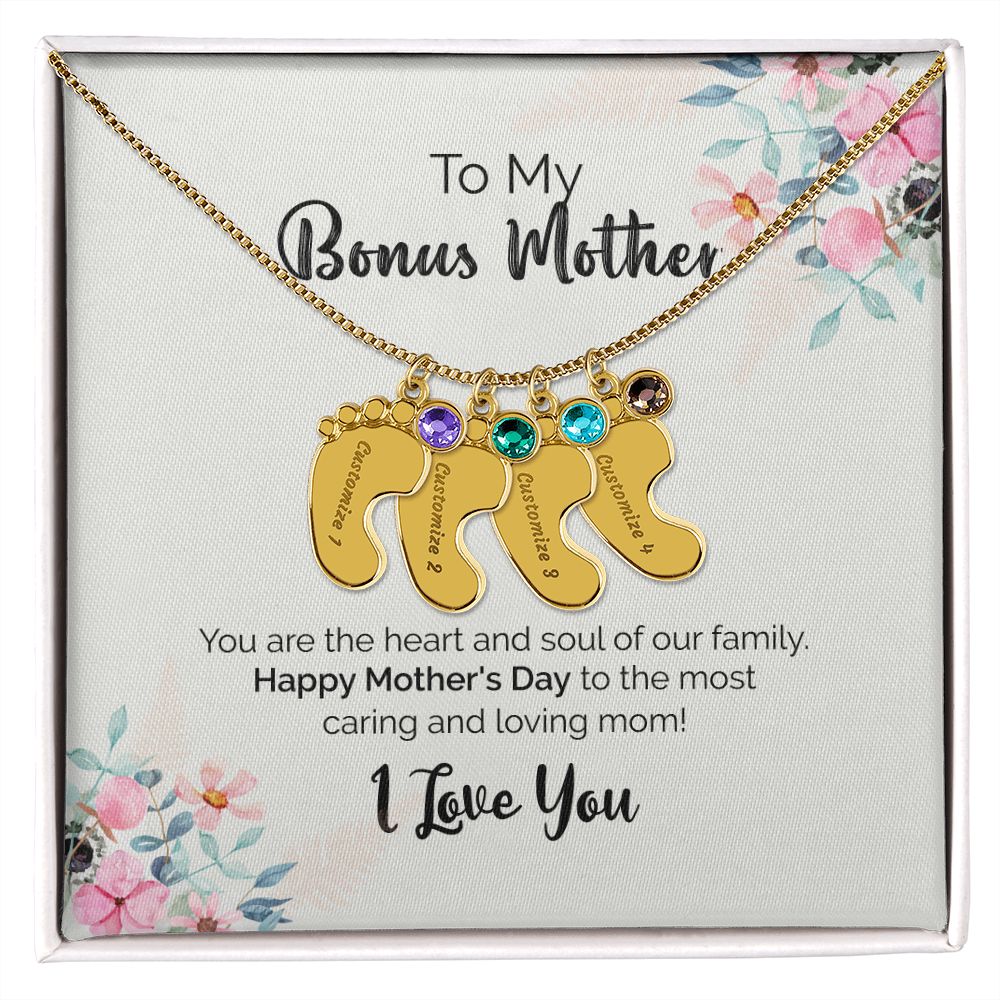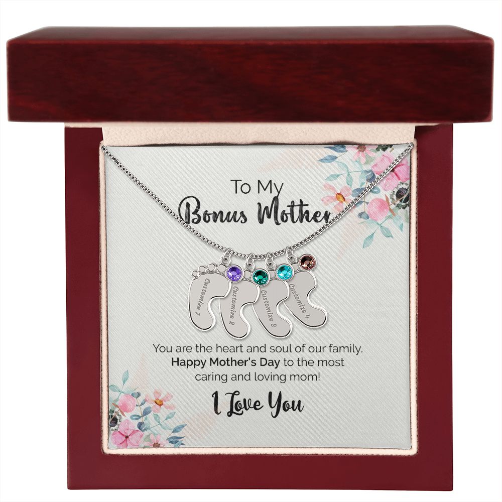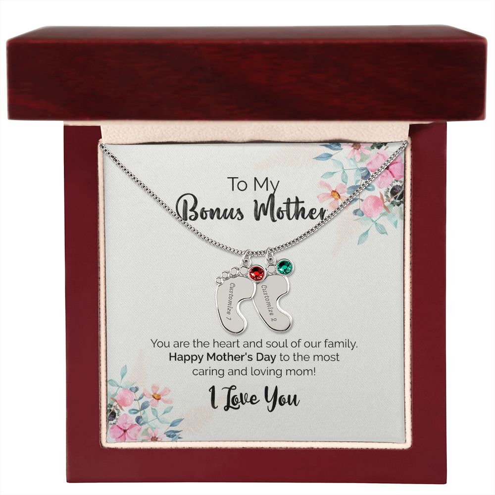 To My Bonus Mother | I Love You | Custom Baby Feet Necklace with Birthstone